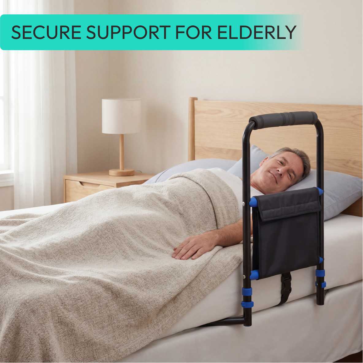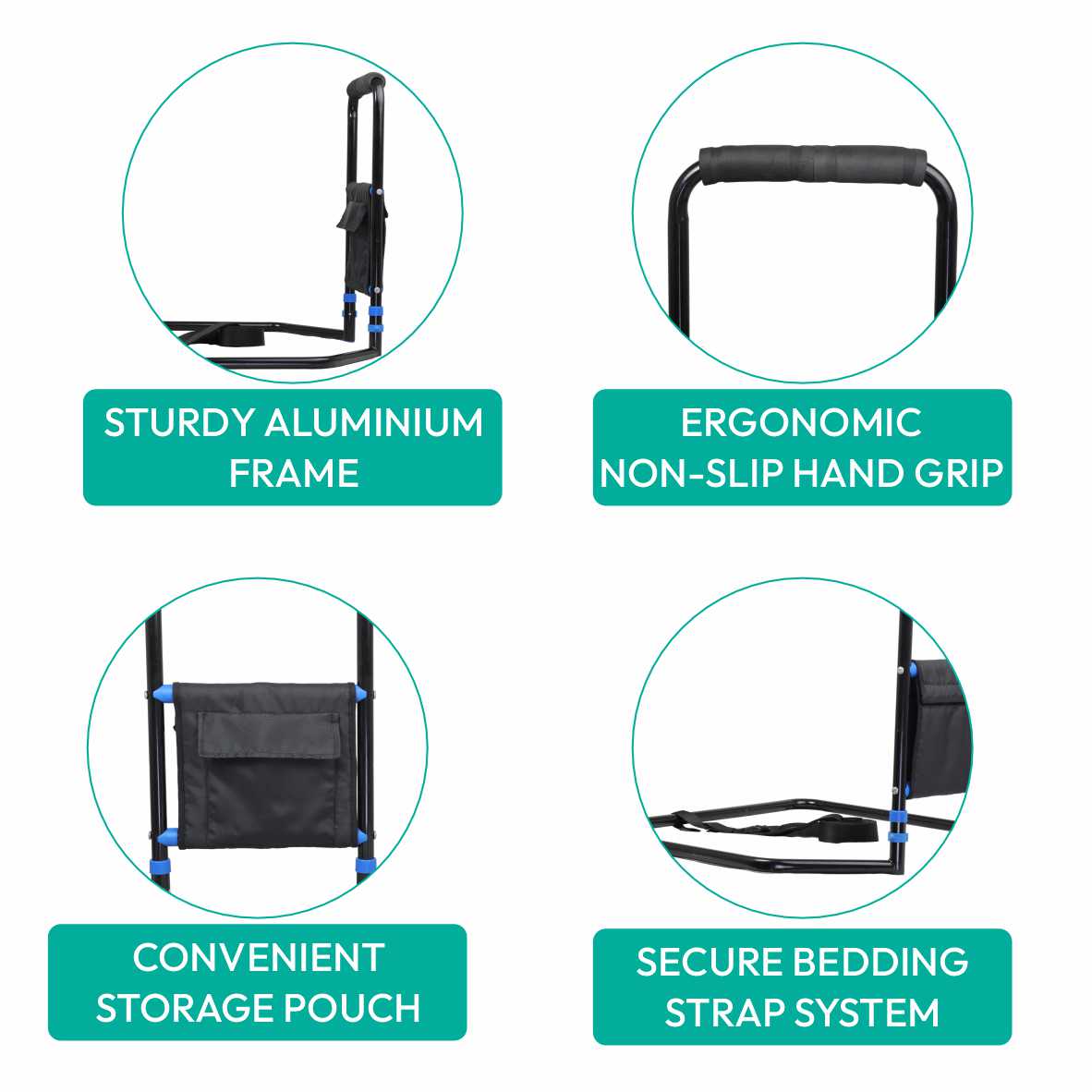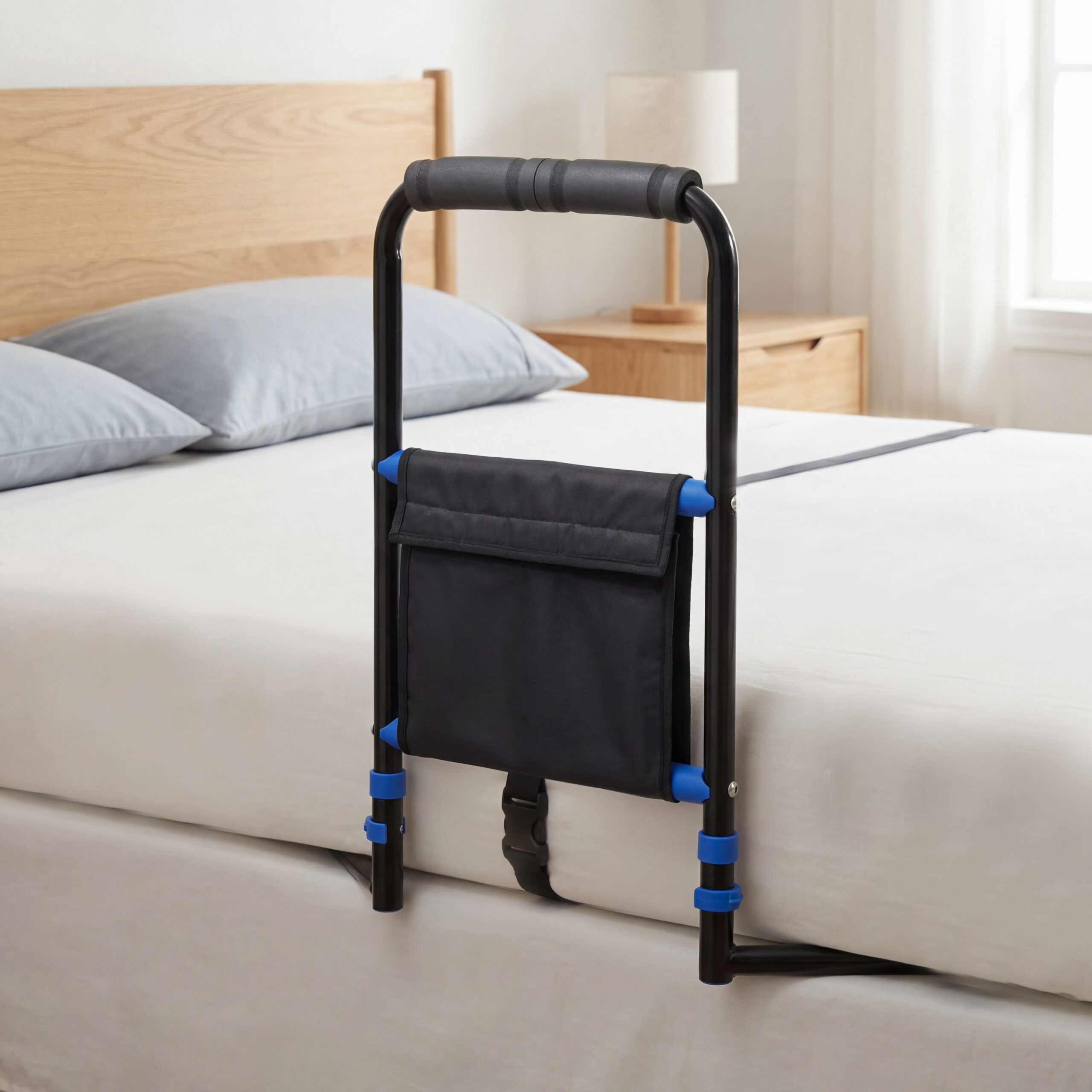 Built with a sturdy aluminium frame, the rail offers excellent strength while remaining lightweight and easy to handle. The ergonomic hand grip ensures a firm hold, while the bedding strap keeps the rail securely fixed to the bed. An integrated storage pouch keeps essentials within easy reach, enhancing convenience for everyday use.